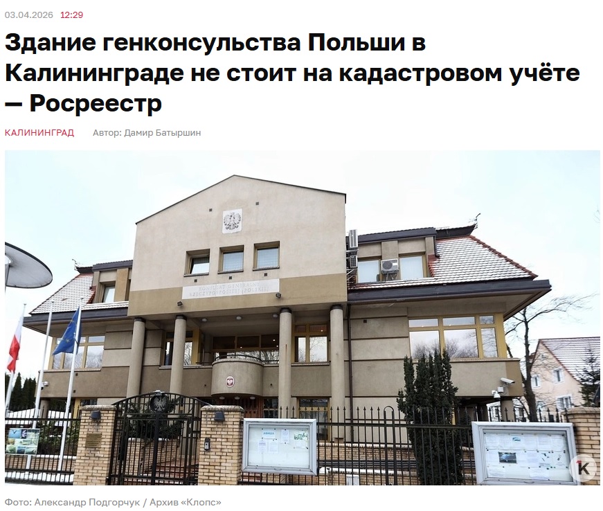 Такое предположение можно сделать, исходя из появления на калининградском сайте «Клопс» информации о том, что «здание генконсульства Республики Польша на Каштановой аллее в Калининграде не стоит на государственном кадастровом учёте».