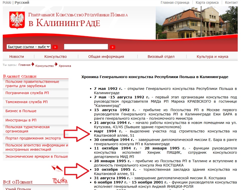 На старом сайте генконсульства Польши в Калининграде была размещена информация о том, что земельный участок под строительство консульства на Каштановой аллее, 51 был выделен в марте 1994 года, а торжественная закладка здания польского консульства состоялась 10 октября 1995 года. То есть Польша его строила самостоятельно и должна была в итоге оформить здание в собственность.
